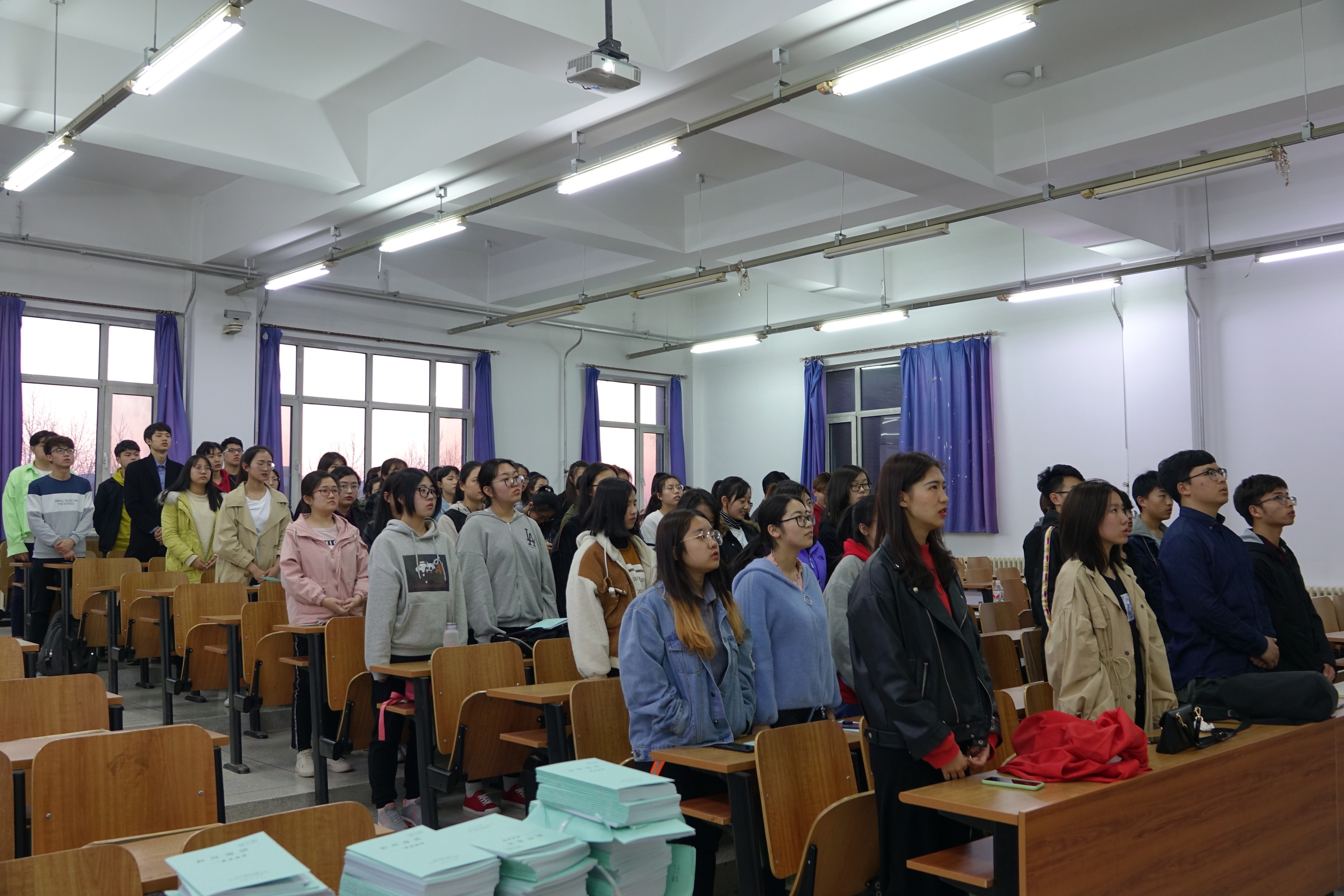 团会开始,首先全体员工齐唱国歌,回忆先辈为新中国浴血奋战的深情。由此可以让同学们深刻意识到美好、和平的生活来之不易,并且时刻谨记着“爱国、民主、进步、科学”的五四精神。
